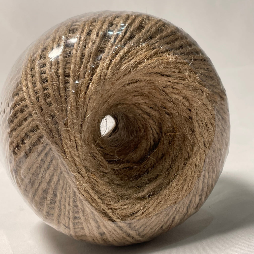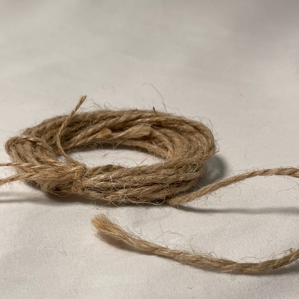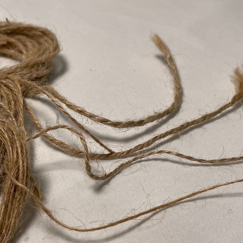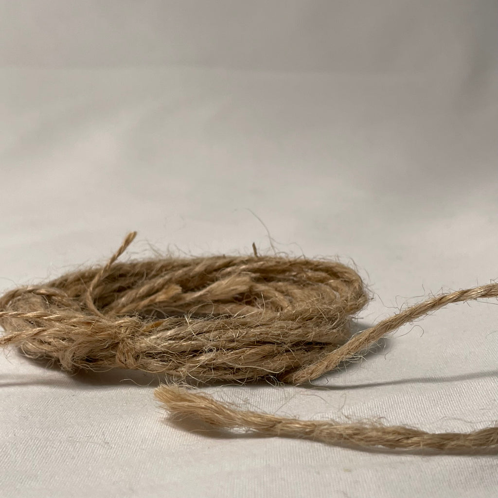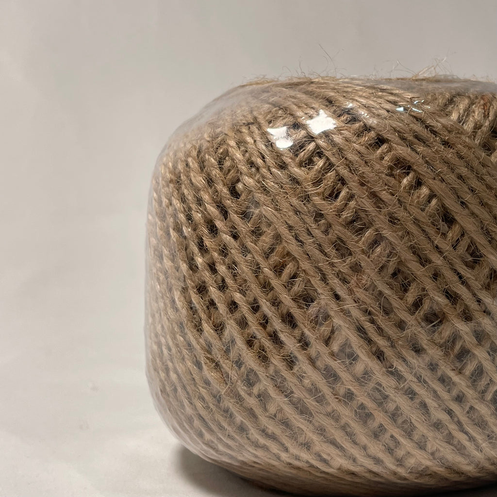 É um cordão feito em juta 100% natural, com 3mm de espessura, aspeto rústico e textura natural visível.